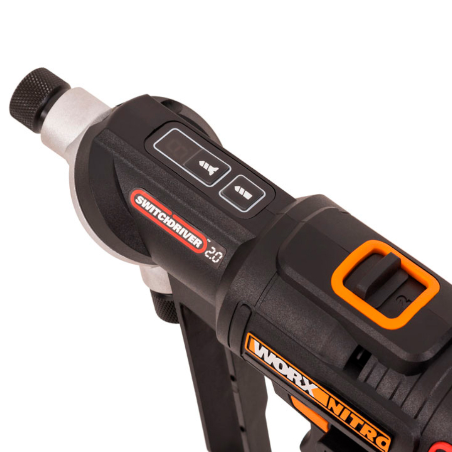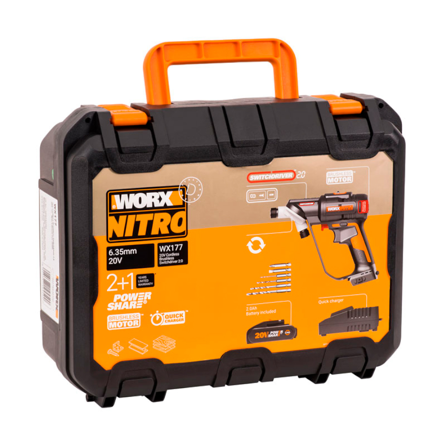 WORX WX177 оснащена поворотной головкой Switchdriver, включающей в себя сразу 2 патрона: один – для установки сверл, второй – для бит и работы с крепежом. Смена режима происходит моментально, что делает инструмент оптимальным решением для ремонтных и строительных работ. Стандартный патрон под шестигранник 6,35мм (1/4”) подойдет для большинства оснастки, представленной на рынке.
