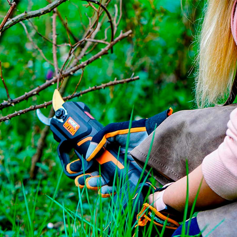 Он работает от универсального аккумулятора WORX POWERSHARE 20В. Секатор производит ровный срез без особого усилия. Секатор оснащен высокопрочными лезвиями с титановым покрытием, что обеспечивает долгий срок службы.