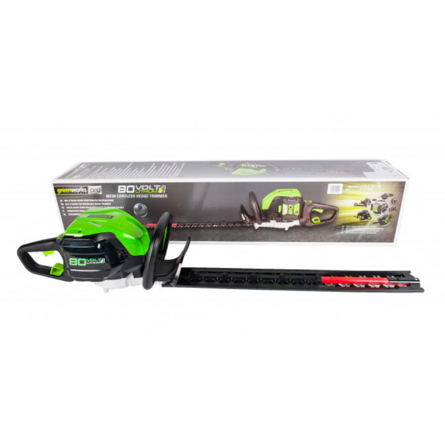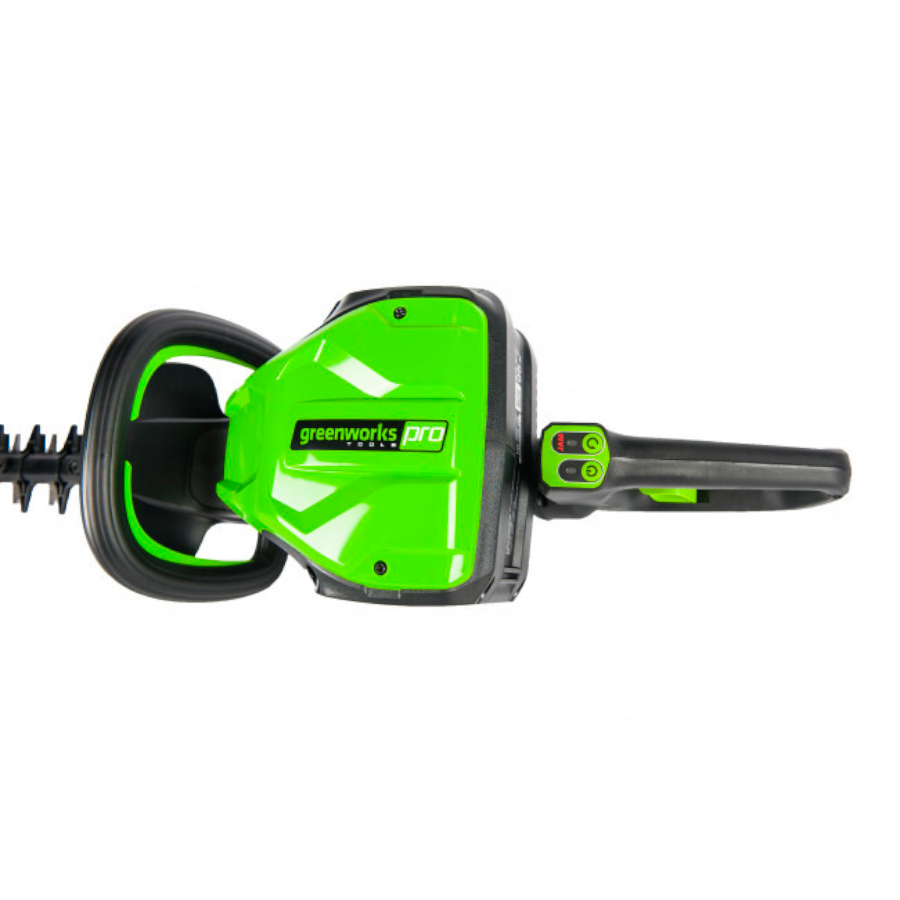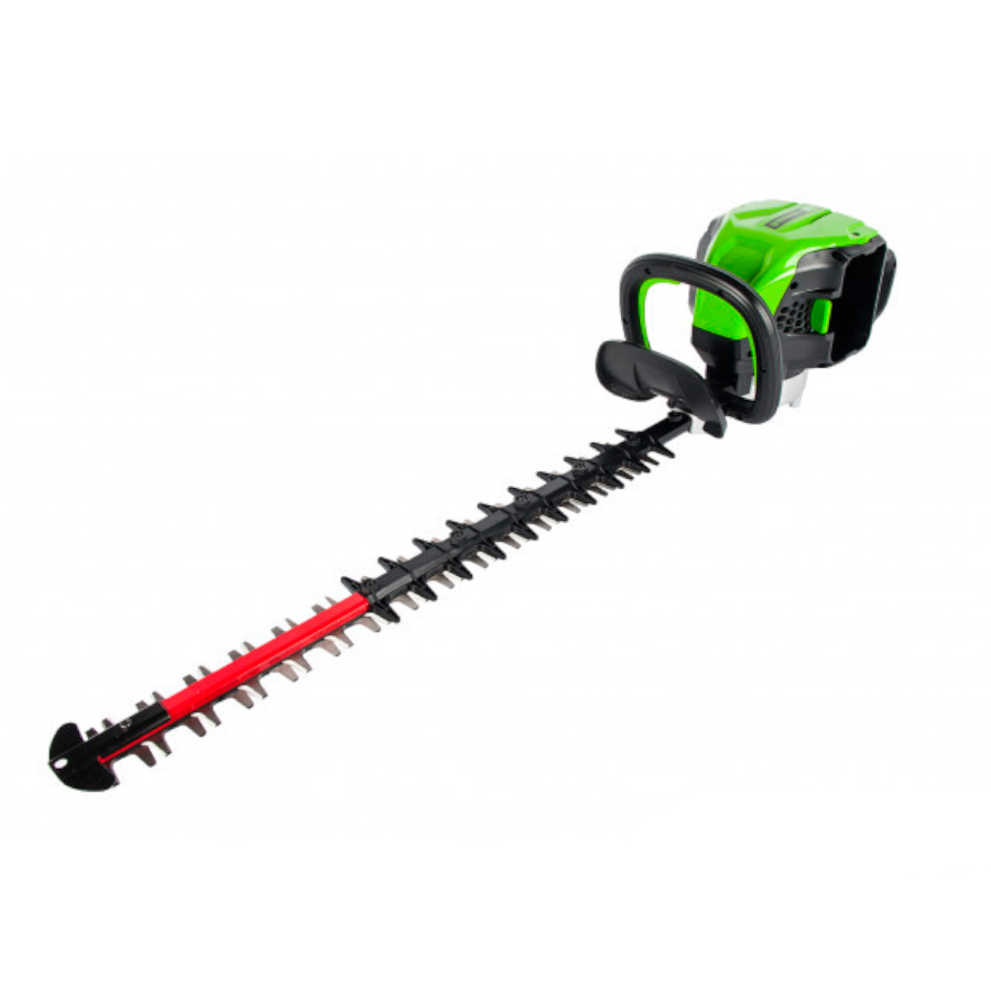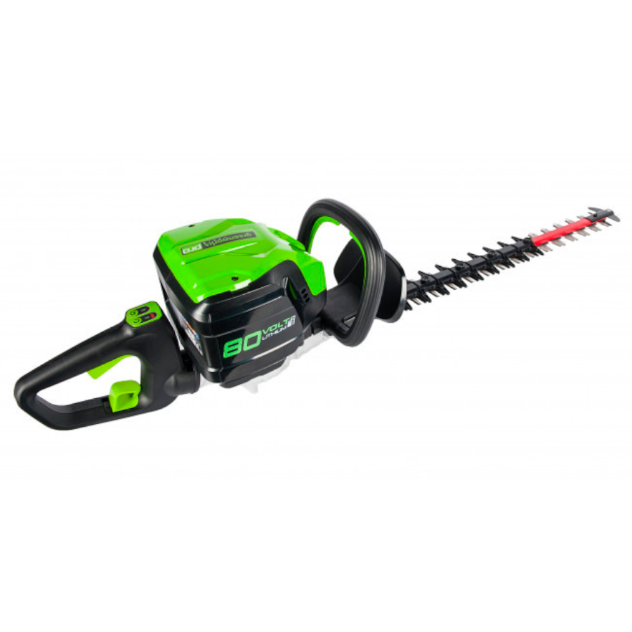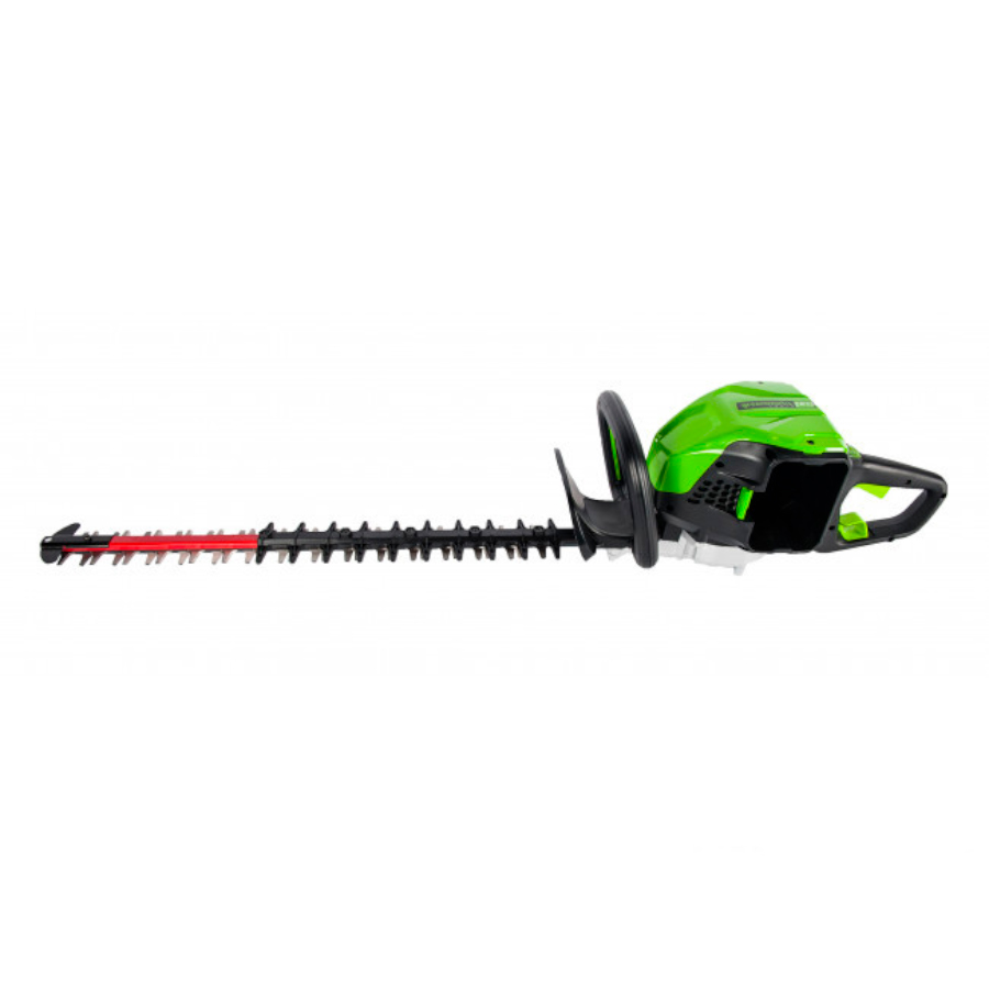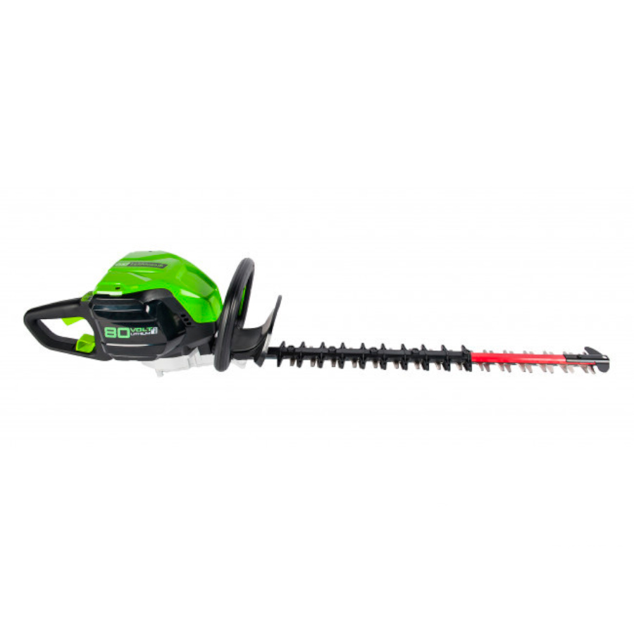 Кусторез аккумуляторный Greenworks из линейки техники 80 вольт (модель GD80HT) - это отличная замена электро или бензокусторезу, которая с легкостью справится с подрезкой деревьев, кустарника или живой изгороди. Модель оснащена надежным бесщёточным двигателем DigiPro, сопоставимым по мощности с бензиновыми аналогами, при этом он абсолютно экологичен, имеет высокий крутящий момент, низкий уровень шума и вибраций, а так же прост в эксплуатации. Рукоятка кустореза с функцией поворота на 180°. Лезвие снабжено реверсивным ходом, длина лезвия 61 см. с алмазной заточкой, а шаг среза равен 33 мм. Данная модель обладает легким весом (всего 5,5 кг.), низким уровнем шума и вибрации, а также эргономичным дизайном рукоятки. Долгое автономное время работы (до 80 минут от 4 А/ч батареи) и отсутствие необходимости использовать бензин и масло, переносить за собой провод - вот ключевые преимущества этого кустореза. Устройство оснащено предохранителем от случайного включения и защитным щитком от пореза рук. Для долговечной работы двигатель имеет защиту от перегрузки.