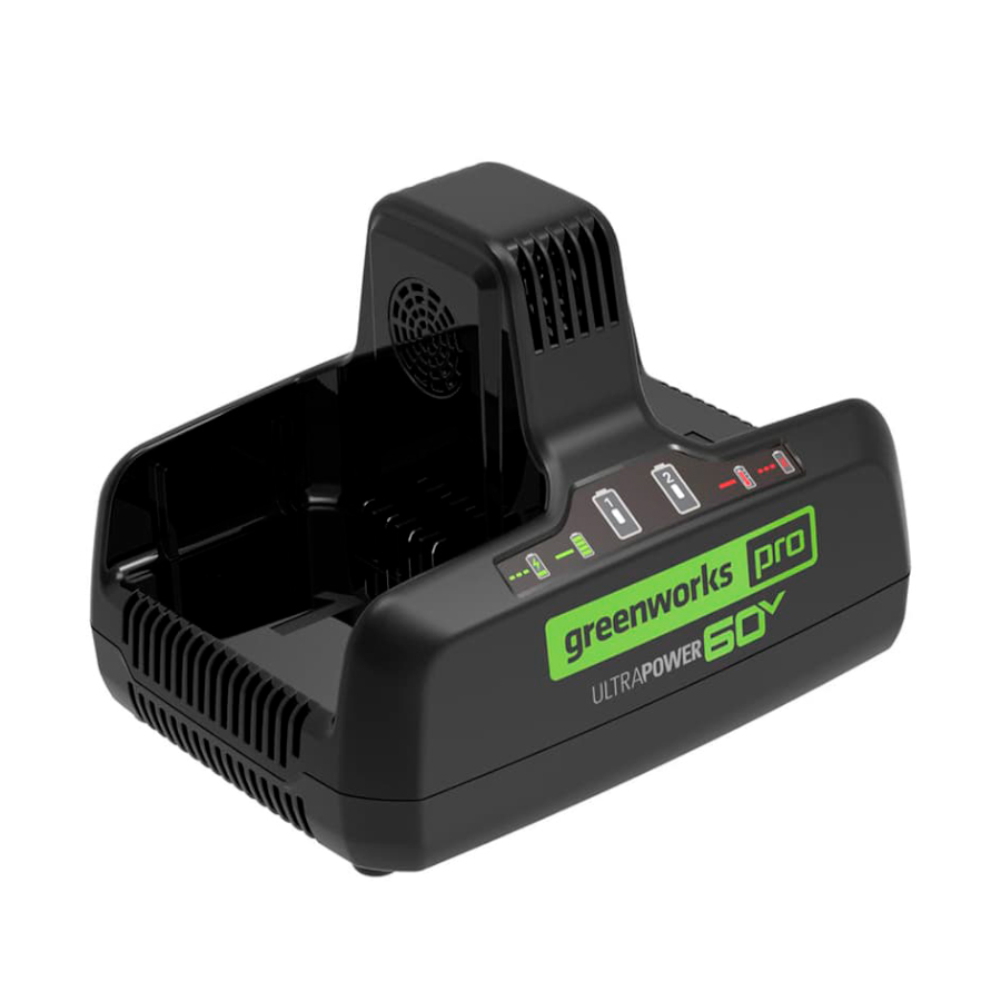 Универсальное зарядное устройство платформы Greenworks 60V.  Предназначено для работы со всеми аккумуляторными батареями Greenworks 60V. Работой зарядного устройства управляет Greenworks Intelligent Power – инновационная система контроля и управления батареей, инструментом и зарядным устройством обеспечивающая максимальную производительность и долгий срок службы. Система Greenworks Intelligent Power обеспечивает защиту аккумуляторного блока от перегрева, от перегрузки, от глубокого разряда, от перезаряда, продлевая тем самым его срок службы. Для защиты аккумуляторной батареи от перегрева зарядное устройство оснащено системой активного охлаждения. Светодиодный индикатор на корпусе зарядного устройства, информирует о состоянии аккумуляторной батареи.