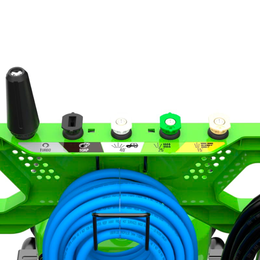 - 4 насадки с различными углами распыления: 15 градусов — для удаления грязи, плесени, краски; 25 градусов — универсальная насадка; 40 градусов — для деликатной мойки; насадка для моющего средства.