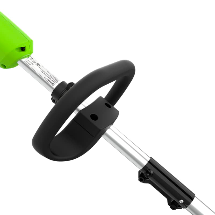 D-образная рукоятка триммера удобна для маневров в ограниченном пространстве. Рукоятка регулируется под рост оператора, перемещаясь вдоль штанги триммера. Входящий в комплект поставки плечевой ремень облегчает нагрузку на руки оператора. Штанга инструмента состоит из нескольких частей для экономии места при транспортировке и хранении.