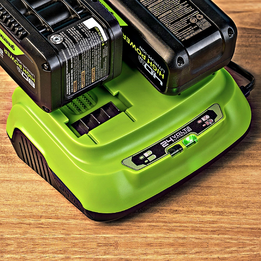 - Двойное зарядное устройство Greenworks G24X2C8;