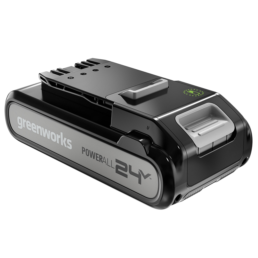 Компактная и мощная батарея платформы **Greenworks POWERALL 24V**. Разработана специально для вертикальных пылесосов, но совместима со всеми инструментами 24V.