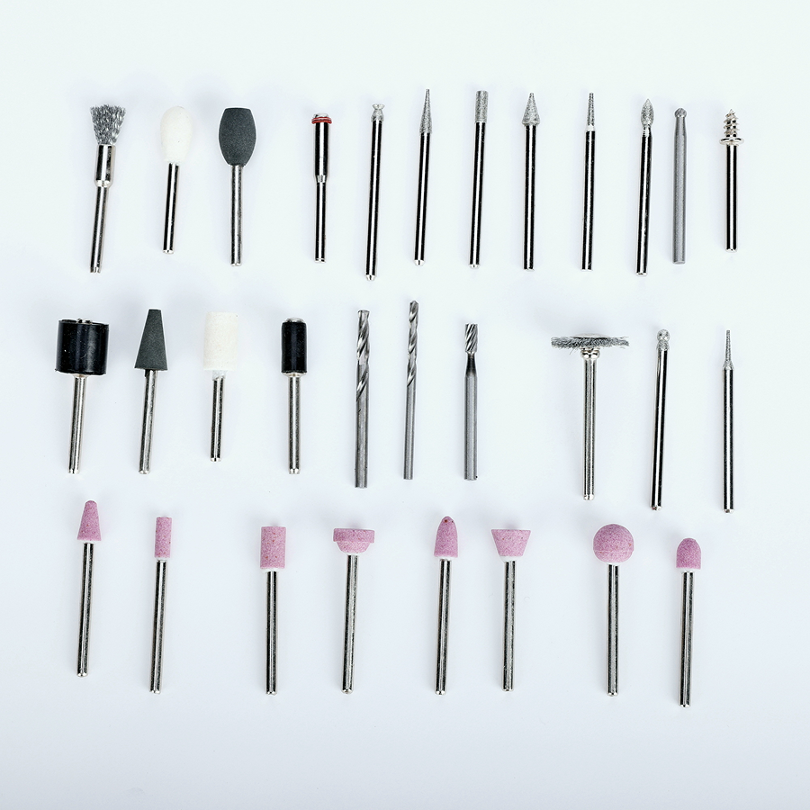 - Оправки, цанги (2,4 и 3,2 мм), точильный камень, гаечный ключ — полный комплект