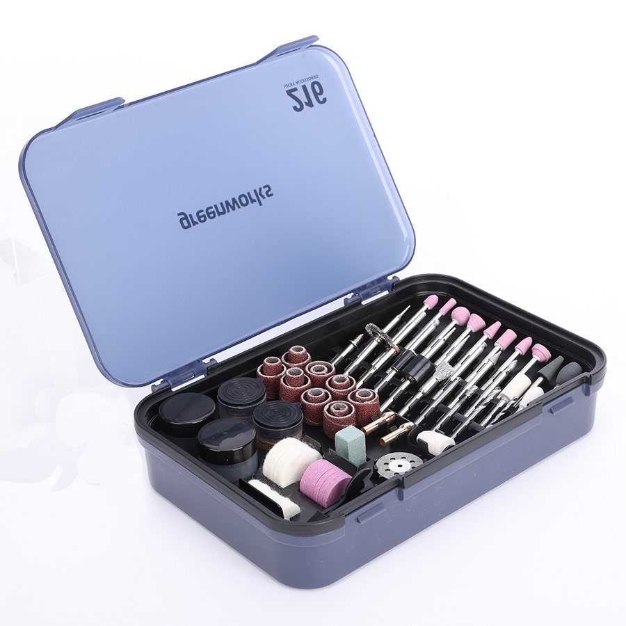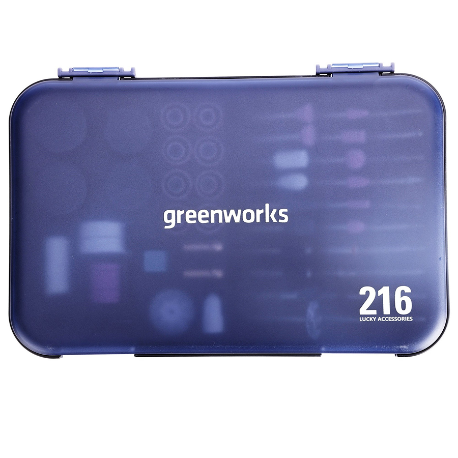 Профессиональный универсальный набор из 216 предметов для аккумуляторных гравёров Greenworks GPT-8VRT (3200707) и G24RT (3200807). Позволяет выполнять гравировку, резку, шлифовку, полировку и сверление практически любых материалов: дерево, металл, пластик, стекло, керамику, камень, кость, ракушки и др.