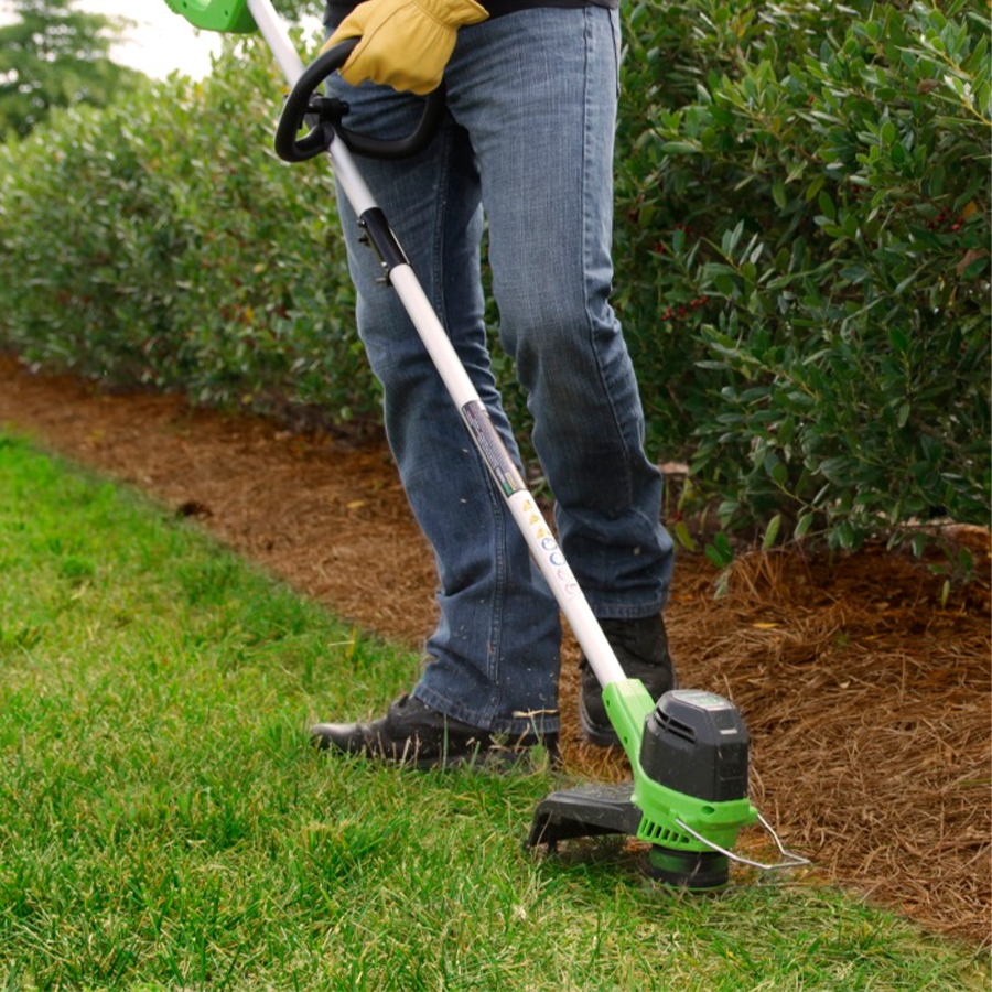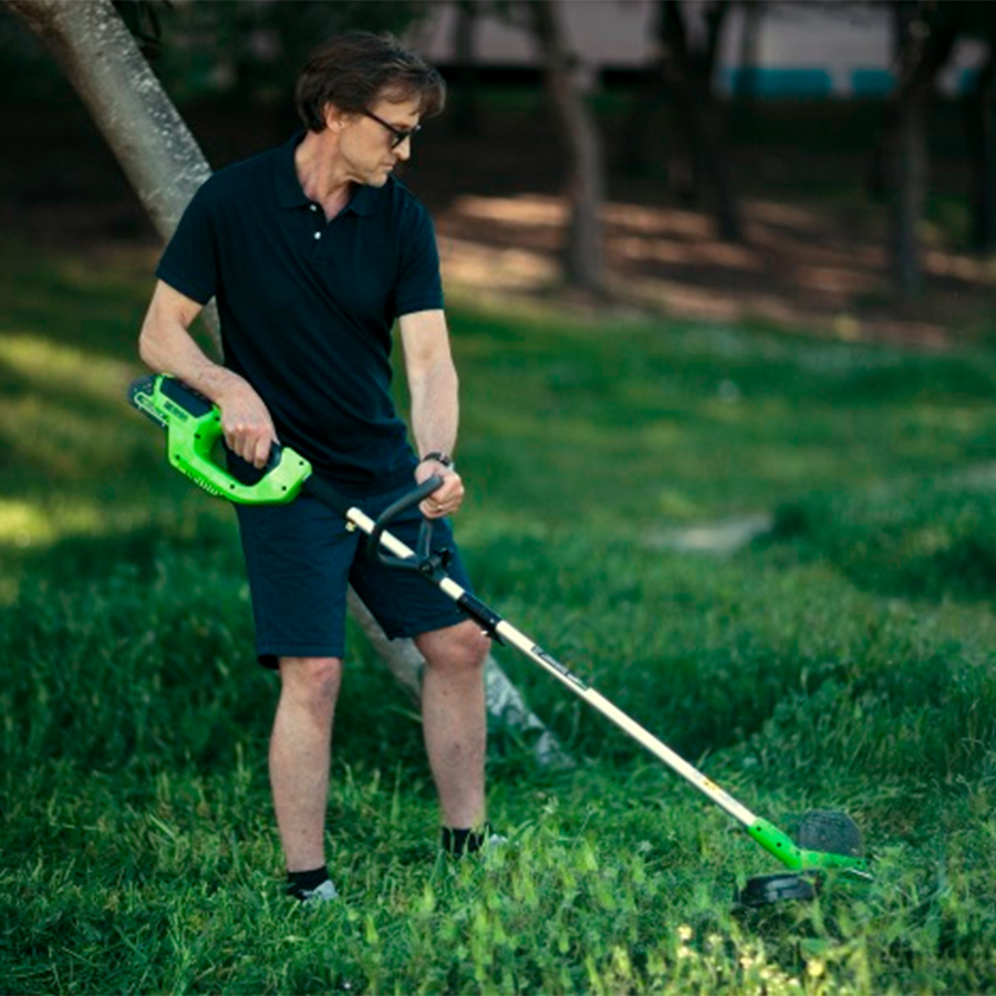 Триммер аккумуляторный Greenworks 40 вольт (модель G40LT) - это отличная замена электро или бензиновому триммеру, он легко справиться с высокой травой и даже с небольшим кустарником. Его основное применение - подрезка травы в труднодоступных местах, где обычная 4-х колесная косилка просто не прокосит траву. Например это узкие и неровные места, большие уклоны и т.п. Модель обладает легким весом (всего 4,2 кг), низким уровнем шума и вибрации, а также эргономичным дизайном рукоятки с упором в предплечье. Долгое автономное время работы (до 48 минут от 4 А*час батареи) и отсутствие необходимости использовать бензин и масло, носить за собой провод боясь его порезать - вот ключевые преимущества этого триммера. Данная модель оснащена предохранителем от случайного включения и защитным кожухом режущей части. Для долговечной работы двигатель имеет защиту от перегрузки. Триммер работает от Li-Ion аккумуляторной батареи G-MAX 40V (2 А*ч или 4 А*ч), которую можно использовать со всеми другими устройствами линейки 40 вольт (15+ устройств). Расширенная гарантия 3 года.