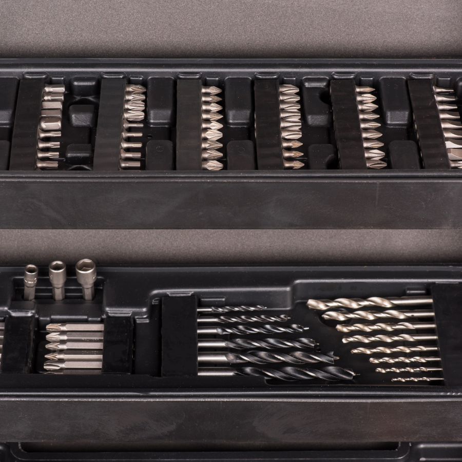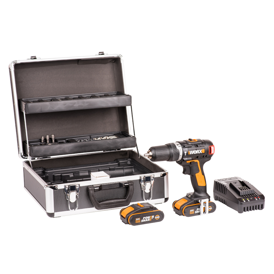 Дрель поставляется сразу с двумя аккумуляторами, зарядным устройством и жестким транспортировочным кейсом.