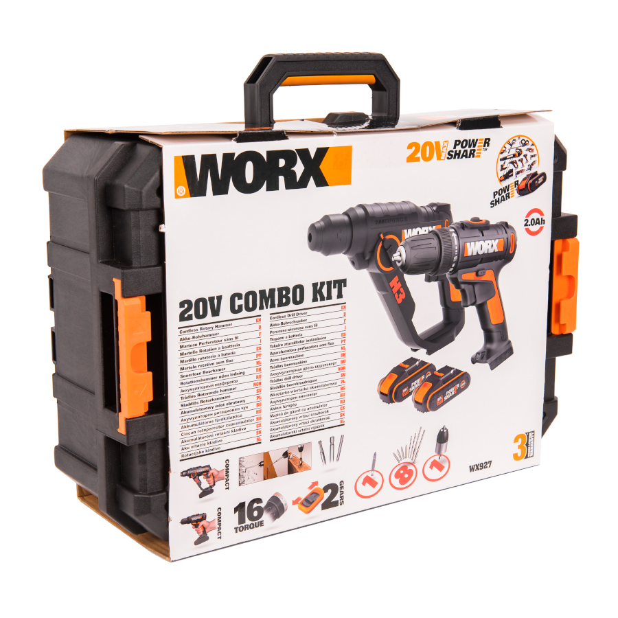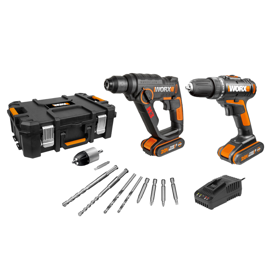Перфоратор аккумуляторный WORX WX390, 2 аккумулятора Li-Ion емкостью 2,0 А*ч, Зарядное устройство WORX 20В 2А, Набор оснастки, Кейс.