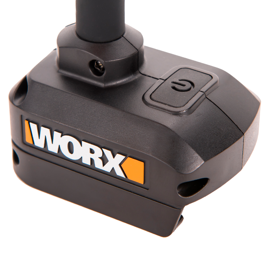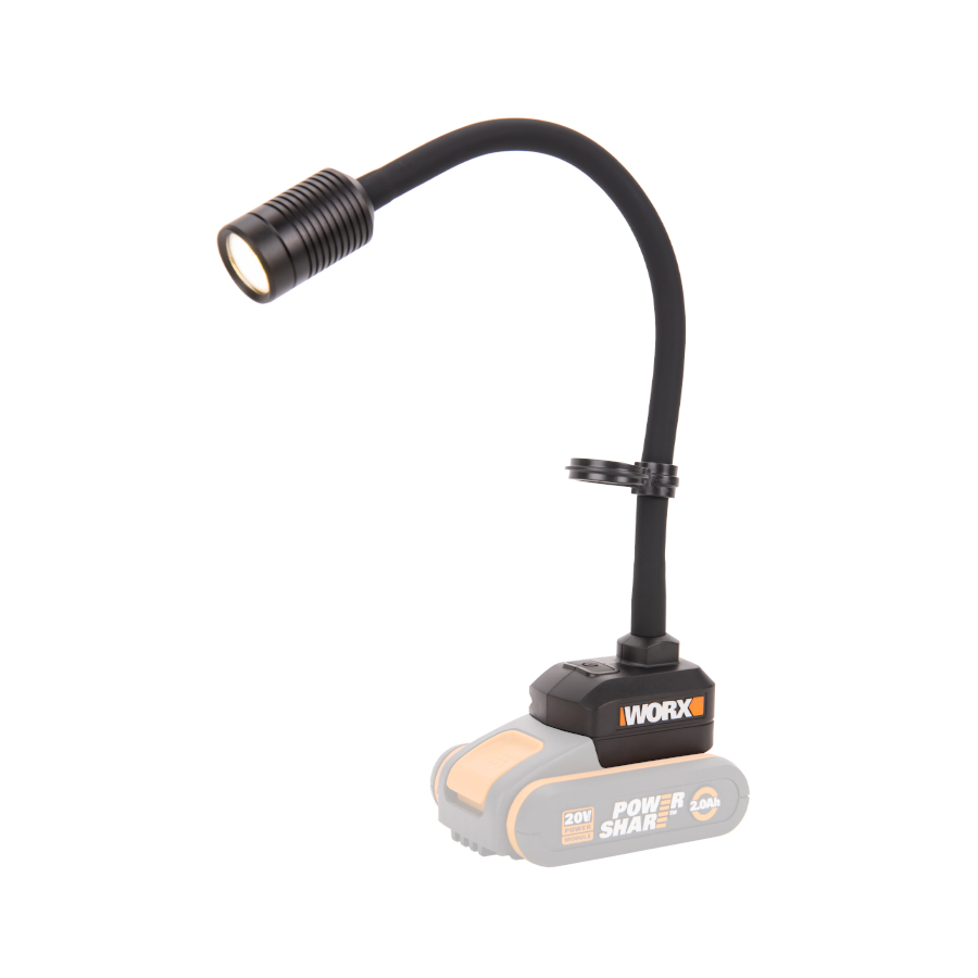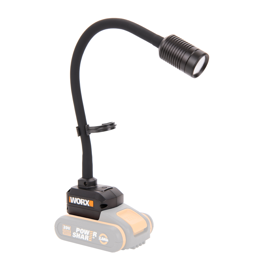 Гибкий фонарь работает от универсального аккумулятора Worx Powershare 20В, который также служит устойчивым основанием. Литий-ионная батарея защищена электронной платой и не боится глубокого разряда.