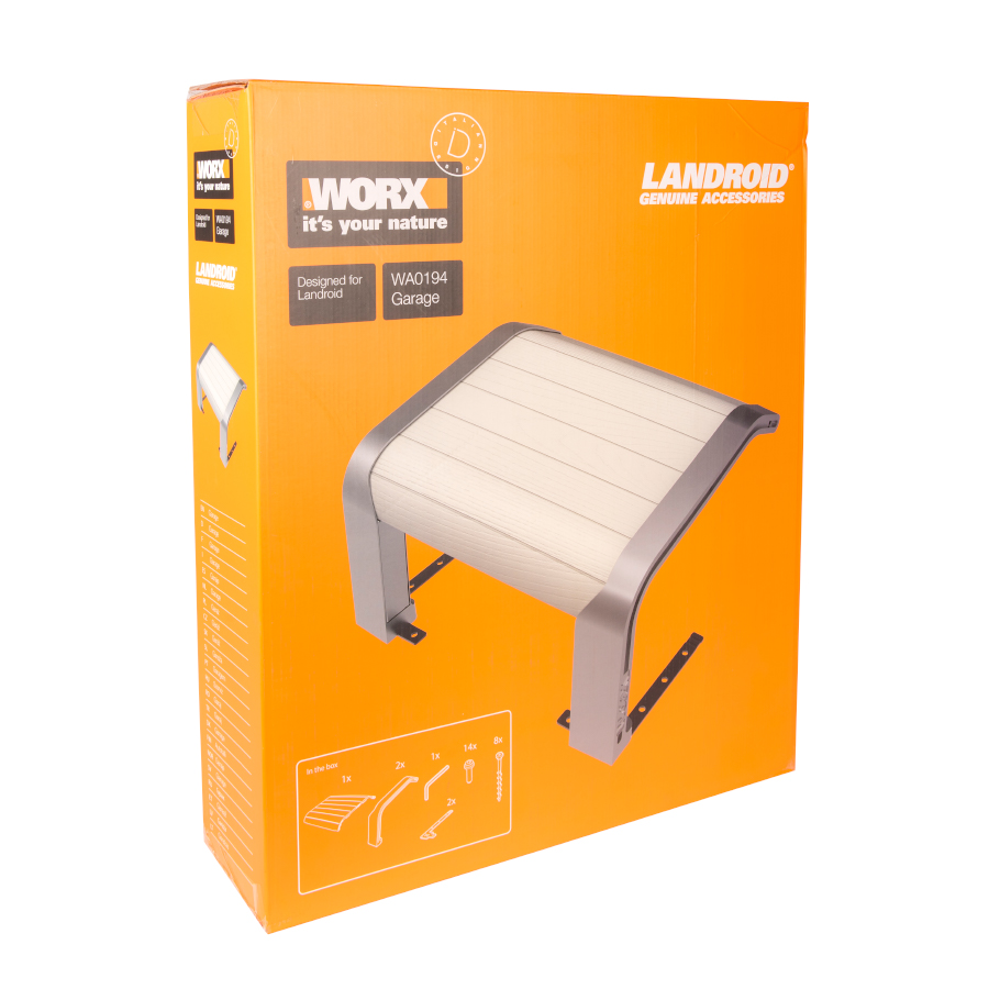 Гараж просто прикручивается к док-станции и совместим со всеми современными моделями газонокосилок Landroid. WORX WA0194 изготовлен из современных материалов и не боится коррозии.